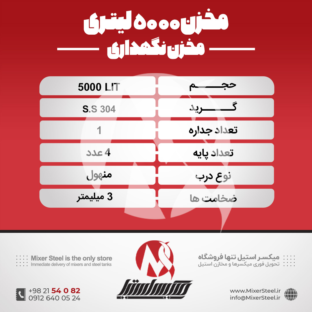 برای استعلام قیمت مخزن استیل 5000 لیتری و ثبت سفارش ساخت، همین الان اقدام کن: تماس برای استعلام و سفارش