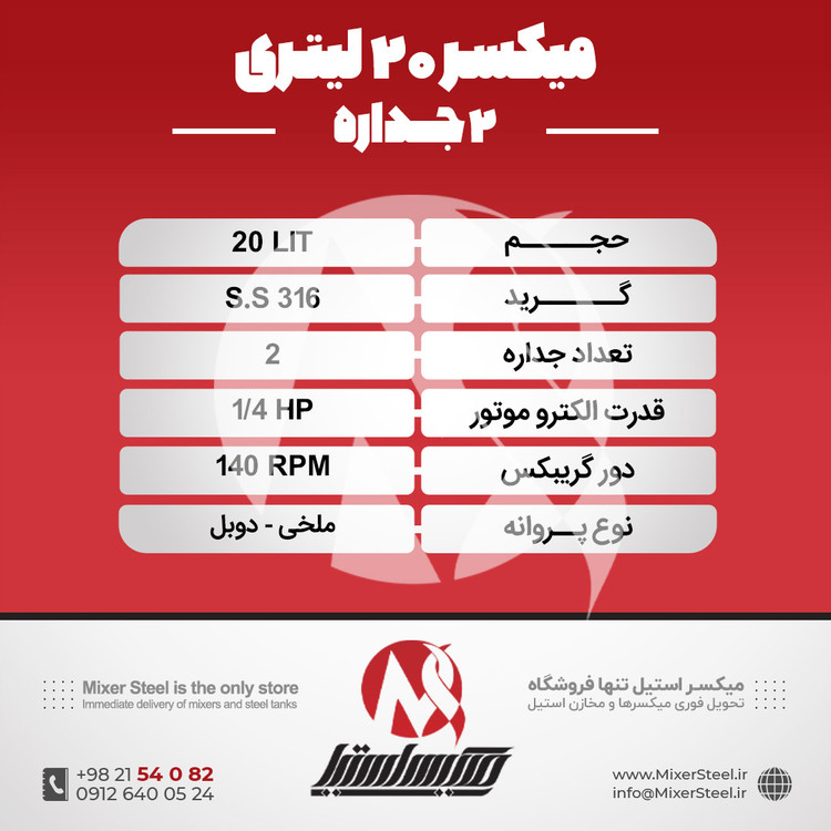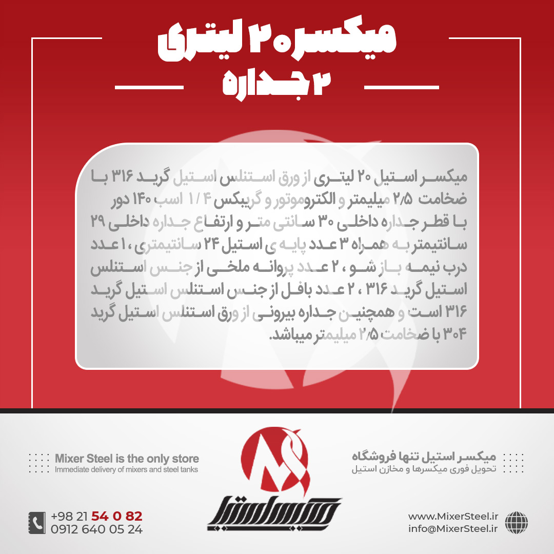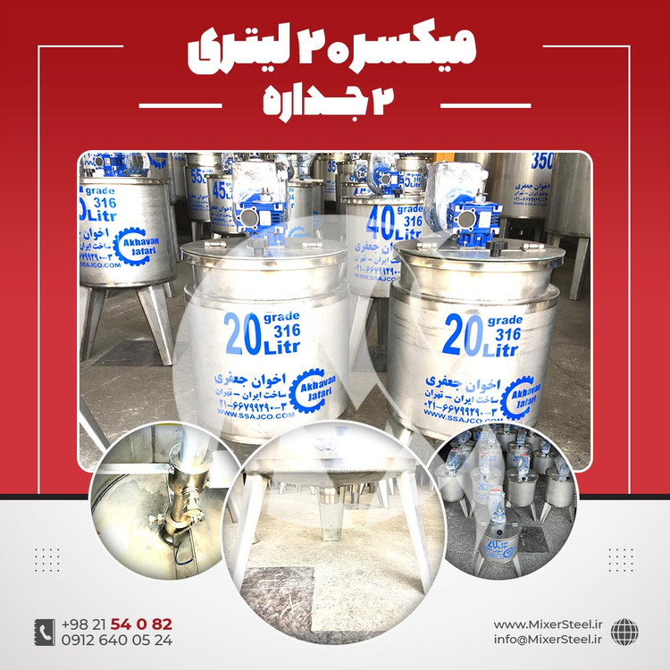 اگر میخوای همین امروز قیمت روز میکسر استیل 20 لیتری 2 جداره رو بگیری و سفارشت رو قطعی کنی، از اینجا پیام بده: تماس با ما