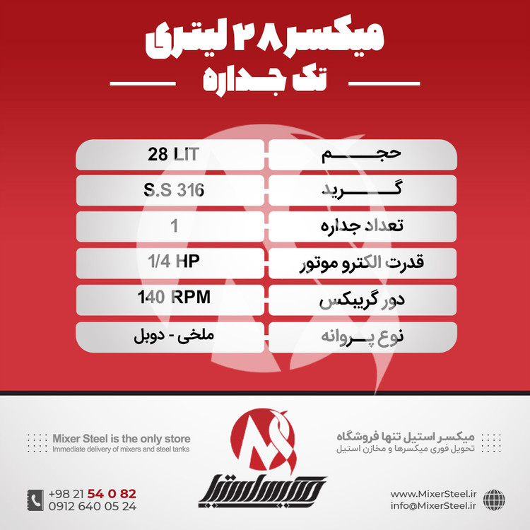 من مهندس امیرحسین جعفری رک بگم: این 28 لیتری برای کسیه که میخواد دقیق کار کنه، خروجی رو کنترل کنه و با خیال راحت روی جنس 316 حساب کنه. برای دیدن مشخصات کامل و برگشت مستقیم به همین محصول: مشخصات و خرید میکسر استیل 28 لیتری